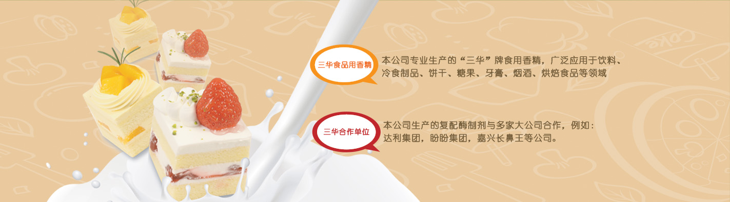 上海三华香精香料有限公司是从事食用香精,香精香料销售的专 业公司。主要分类:炒货食用香精,冷饮饮料用食用香精,乳品植物蛋白类,大众型香精,糖果香精,乳化香精,油质香精,水油香精,水质香精,咸味香精,粉末香精,复配膨化食品稳定剂,复配酶制剂,...